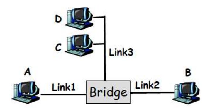 Consider the following LAN consisting of 3 links attached by a bridge. For each of the following cases, describe which links does the bridge forward the packet to and show the bridge forwarding table after the packet is sent.
