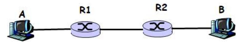 Consider the following network. MTU of the link between A and R1 is 1500 bytes. MTU of the link between R1 and R2 is 512 bytes. MTU of the link between R2 and B is 1500 bytes. Assume that the transport layer gives a packet of size 2000 bytes to IPv4 for delivery to B. Define the MTU of a link to be the maximum payload size of a link layer frame, i.e., maximum size of an IP packet that can fit into a Link Layer frame.