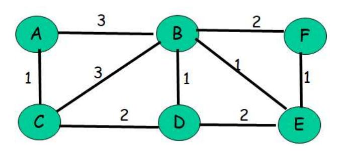 Consider the following network: Assume nodes run a distance-vector protocol to compute the shortest path to all destinations. Show the distance table at node A and derive the forwarding table.